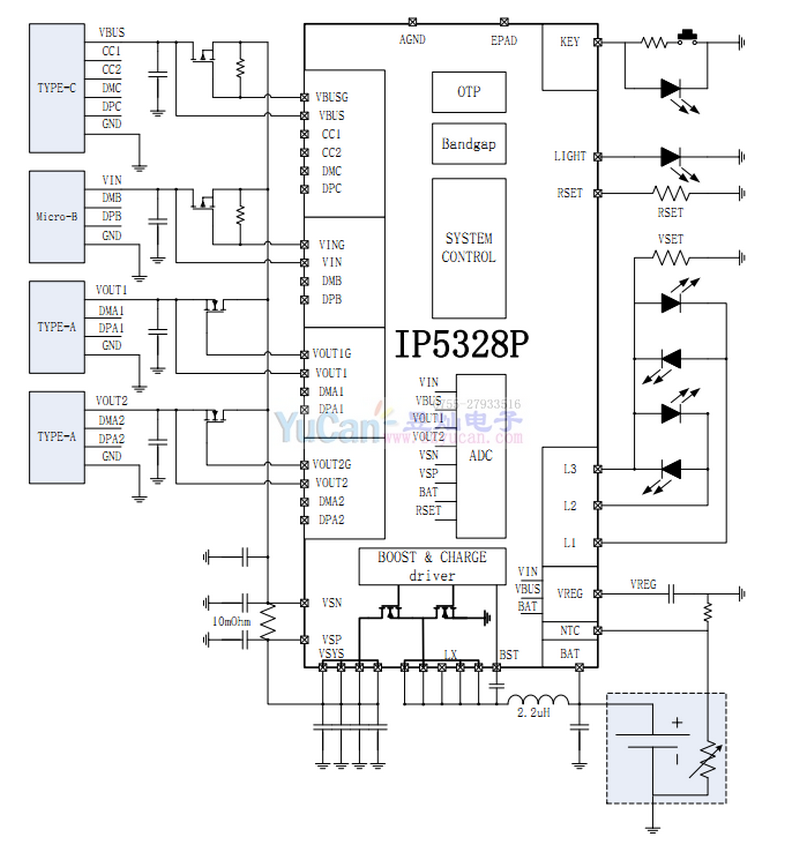 IP5328P的同步開關充電系統(tǒng),提供高達5.0A充電電流。內置IC溫度、電池溫度和輸入電壓控制環(huán)路,智能調節(jié)充電電流。
