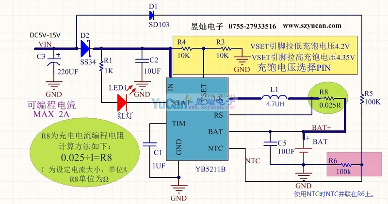 YB5211 SOP8內置MOS 4-20V寬工作電壓 單節(jié)4.2V 4.35V電壓可調 2A充電電流可調 高效開關式降壓充電芯片